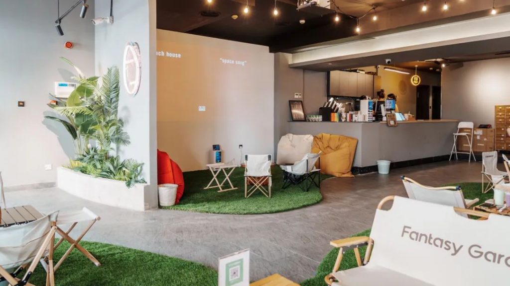 店内的装修清爽大气,每个板块的空间都各具特色,一进门就是电影区的摆着豆袋沙发的大草坪,很有户外野奢风的感觉。剧本杀区私密性强,各种道具摆在架子上气氛十足,为用户带来沉浸式的代入体验。网吧区外设闪着的五彩的光线,电竞感十足,墙上挂着的是老板收藏的詹姆斯等NBA球星的签名球衣,这是多少人心中激情澎湃的信仰。