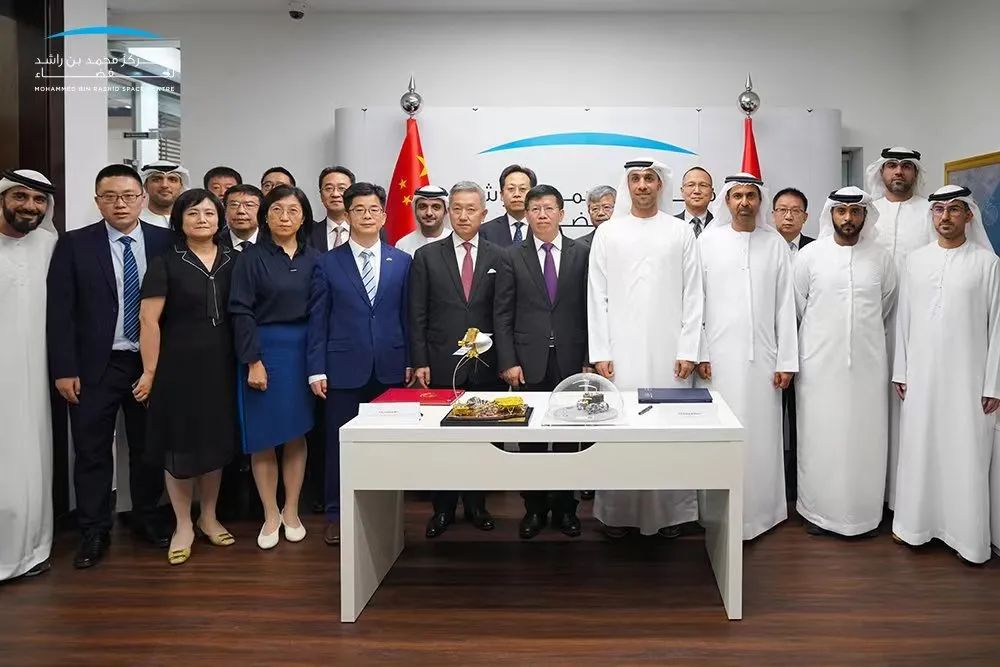 中国驻阿联酋大使张益明与拉希德航天中心董事会副主席优素福共同见证备忘录签署。中国驻迪拜总领事李旭航、阿外交与国际合作部东亚司副司长卡尔卡维等共同出席签字仪式。