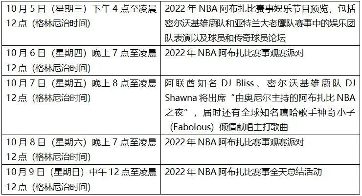 亚特兰大老鹰队和2021年NBA卫冕冠军密尔沃基雄鹿队将于2022年10月6日(星期四)和10月8日(星期六)晚上8点(格林尼治时间)在阿布扎比亚斯岛的阿提哈德竞技场(Etihad Arena)进行两场季前赛。2022年NBA阿布扎比赛事将是NBA球队首次亮相阿拉伯联合酋长国(阿联酋)和阿拉伯湾。