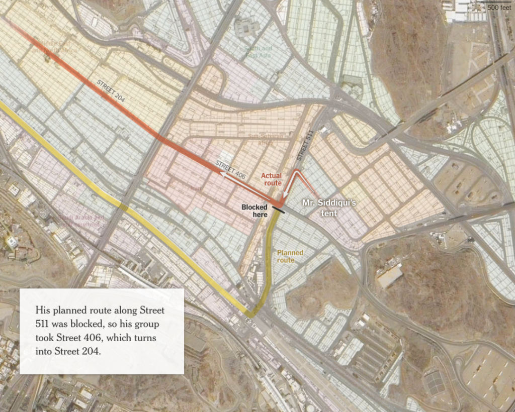 道路开始变窄,越来越多的人涌入,人群的压力开始剧增……突然之间人们争先恐后爬上道路两旁的栅栏,似乎想逃离什么……就这样身不由己、不受控制地被卷入了一股浪潮之中,只能随着人群移动、摔倒,甚至被抬离地面……越来越多的人死于窒息,人群是那么拥挤,以至于站着也能窒息而死……眼睛所见之处,皆是死尸。凉鞋、轮椅和成堆穿着白袍的尸体铺满了沥青路面。事后的调查分析表明,拥挤的人群长度达到了300多米。