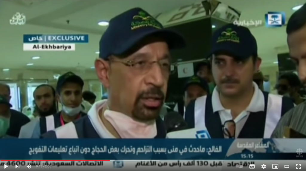 事故发生后,沙特国家电视台只是在正常的朝觐节目中,以文字形式报道了踩踏事件,然后短暂播放了一些将伤者抬上救护车的画面。按照沙特政府的说法,悲剧发生的原因是因为“一些朝圣者没有遵守当局发布的指导方针,而极端的高温和疲劳加剧了踩踏事件(的发生和恶化)”。