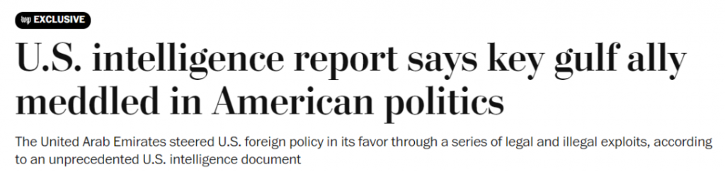 近期,美国情报部门编写了一部机密报告,指控多年来的海湾盟友阿联酋一直在操控美国政治。