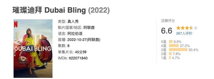 这个真人秀其实去年就在Netflix出完了,一共8集。延续了美国真人秀《璀璨帝国》(Bling Empire)的形式,这是这个系列首次来到中东,居然是全系列中豆瓣评分最高的一部(虽然也只有6.6分)……
