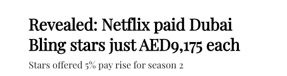 本来这个真人秀已经出完了,因为套路满满,其实也没什么特别值得说的,但近期的一个瓜又把这个剧送上了迪拜热搜 —— 这些剧中光鲜亮丽的土豪们,片酬居然不到1万迪拉姆/集 —— 这也不比打工人强多少啊……