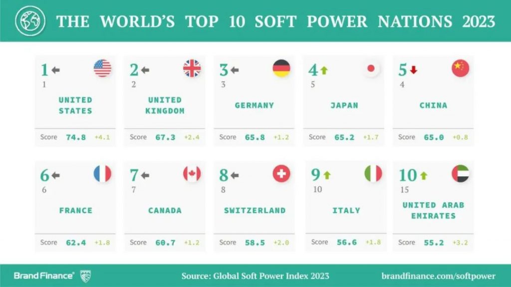 根据周四发布的2023年全球软实力指数(Global Soft Power Index 2023),阿联酋的软实力首次冲进世界前十,并且是中东唯一一个进入前十名的国家。