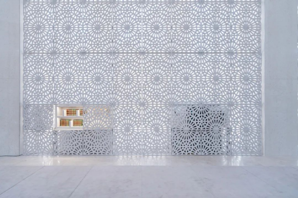 通过墙壁上470多块可操作的精致格子板,创造了规模宏大的Mashrabiya —— 伊斯兰建筑最具特色的特征之一。Mashrabiya不仅具有很强的观赏性,也具有允许空气流通、调节光线和保护隐私的功能。