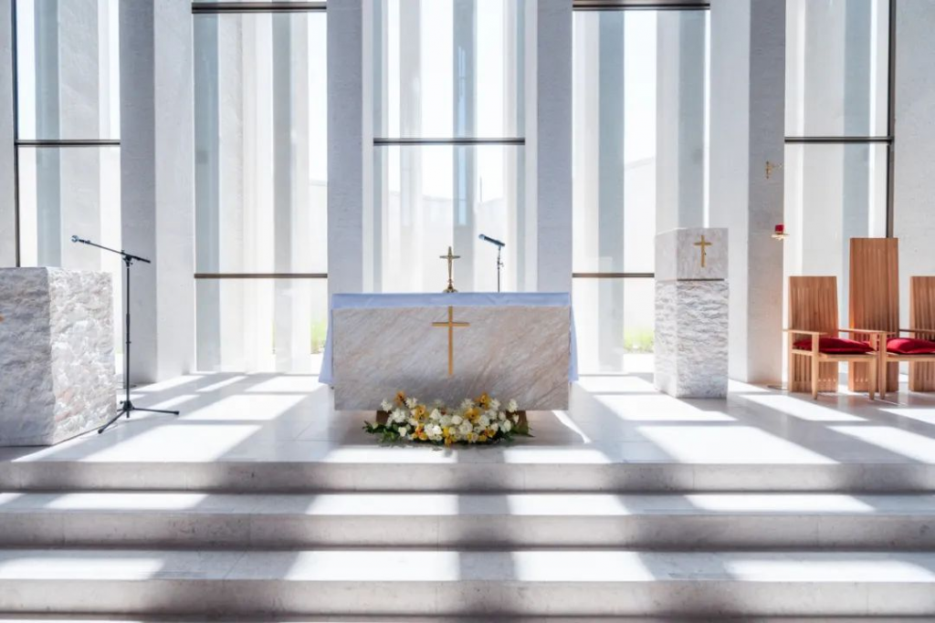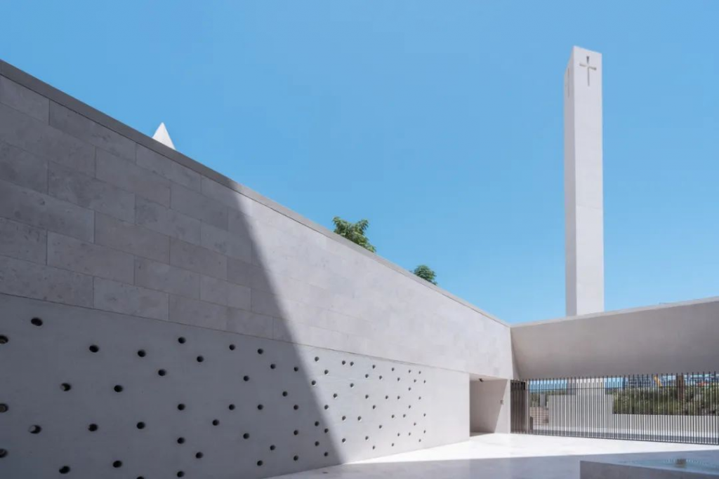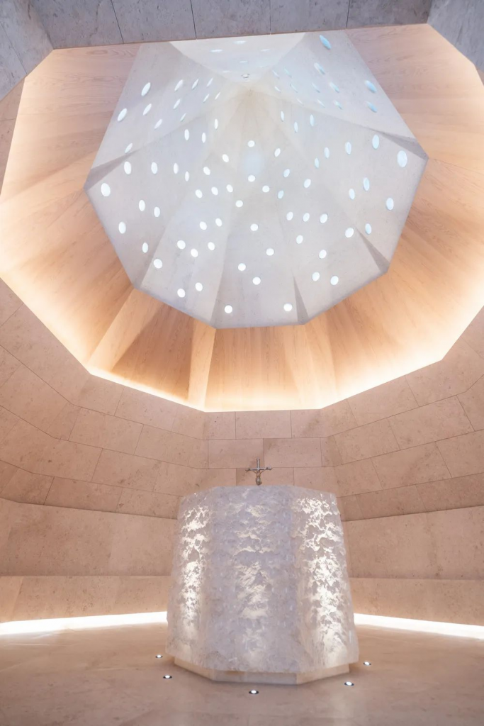 教堂的洗礼池和古代一样为八角形,呈圆锥形。这里的巧妙之处在于当太阳在一天中移动时,光线穿透圆锥体,能够在空间中产生梦幻般的光之碎片。