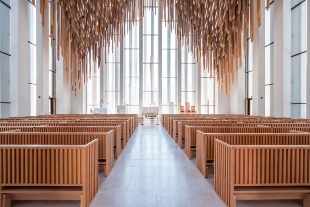 基督教堂的设计基于“狂喜救赎之雨”的理念,在一系列线性木条中呈现。总长度超过13000米的木材构成了教堂的拱顶。整个教堂神圣庄严,有有着秩序和严谨的感觉。