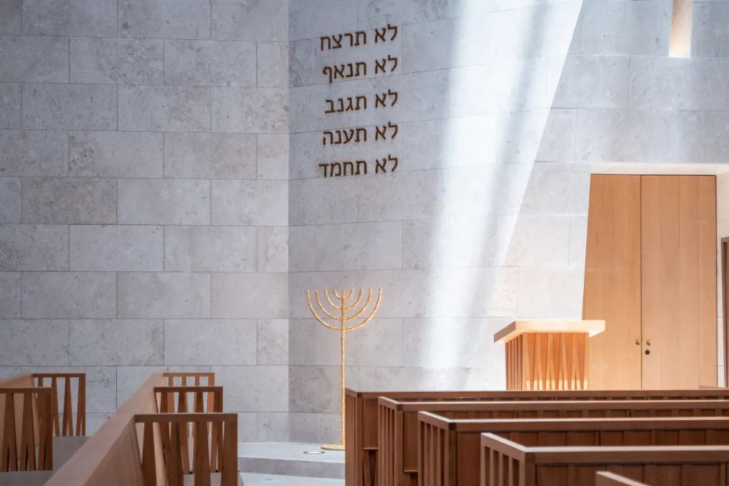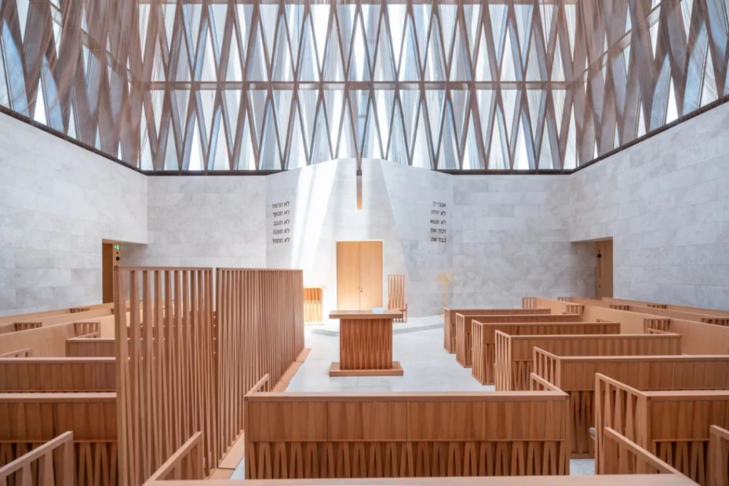 犹太教会堂面向耶路撒冷。外观采用的是三层V形石柱,仿佛重叠的棕榈叶层。