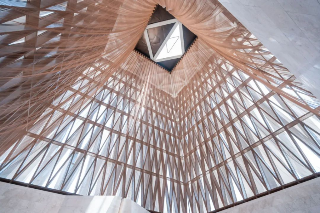 犹太教会堂室内有一个悬挂的青铜网帐篷从天花板的中央天窗垂下,悬挂在会堂上方,日光通过柱廊和悬挂的青铜网折射,在犹太教堂内部产生斑驳的光影,仿佛阳光闯过层层棕榈叶。