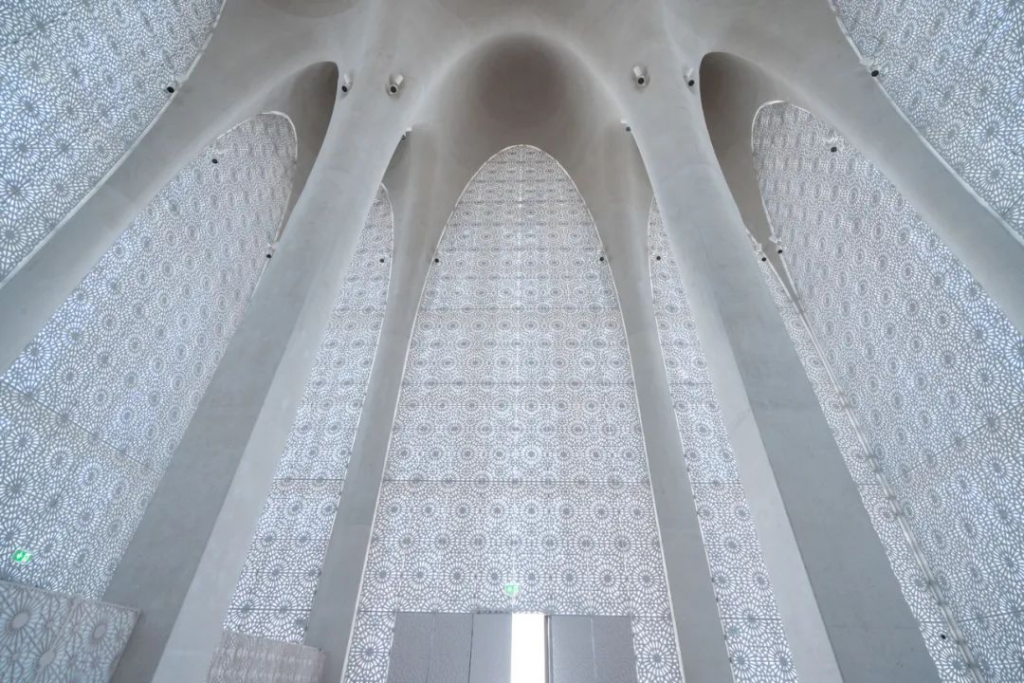 清真寺有两个外部洗礼室,分别供男女礼拜者使用。男性洗礼室呈倒金字塔形状,女性洗礼室呈倒球体形状,给人一种厚重的惊奇感。