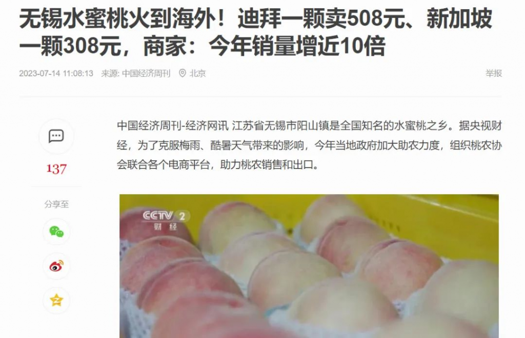 根据央视财经报道,江苏省无锡市阳山镇的水蜜桃今年有着10倍的销售量增长。其中一颗超过一斤重的水蜜桃在国内能卖到200元,如果出口到迪拜,在迪拜可以卖到508元(约270迪拉姆)。