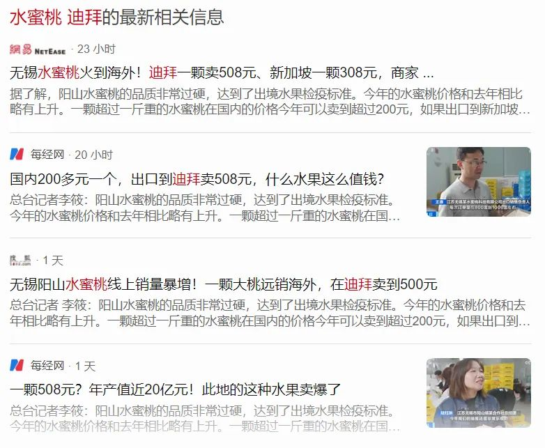 这个新闻很快被引援到各大网站平台,获得了不错的流量和热度。其中“一颗阳山水蜜桃迪拜卖508元”这个信息让人印象深刻,更是被很多媒体当作标题使用。