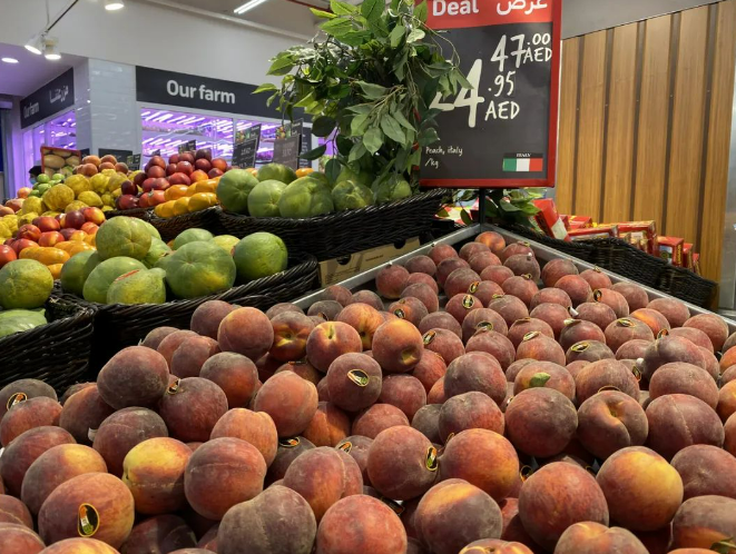 来自意大利的桃子,打完折24.95迪拉姆1公斤,一斤的话人民币约23块多。拍摄于家乐福超市,2022年。