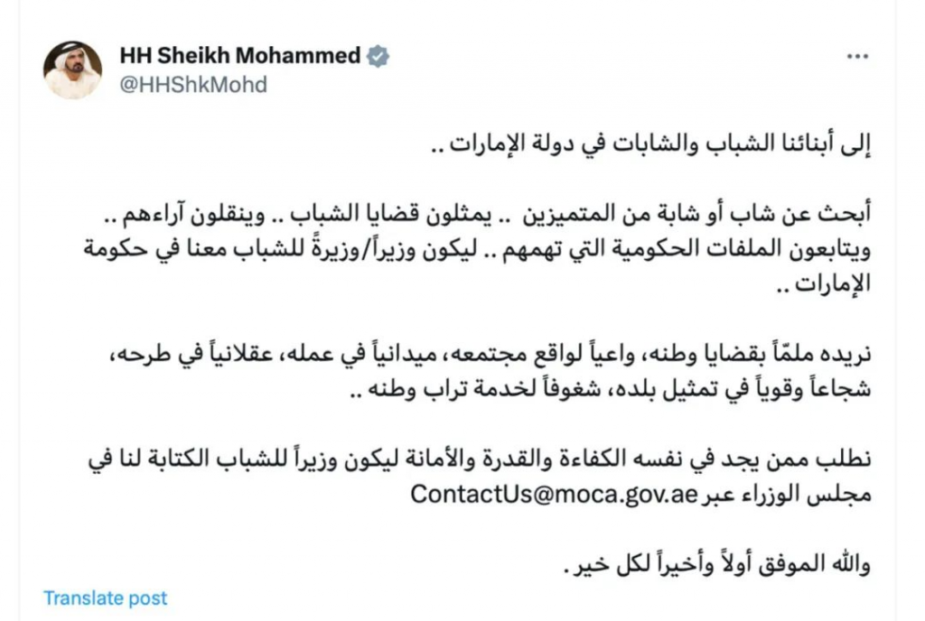 阿联酋副总统、总理兼迪拜酋长谢赫穆罕默德·本·拉希德·阿勒马克图姆在自己的社交媒体上表示,他正在寻找一位杰出的年轻男子/女子来处理该国的青年议题。他表示,被选中的申请人将成为阿联酋内阁的青年部长。