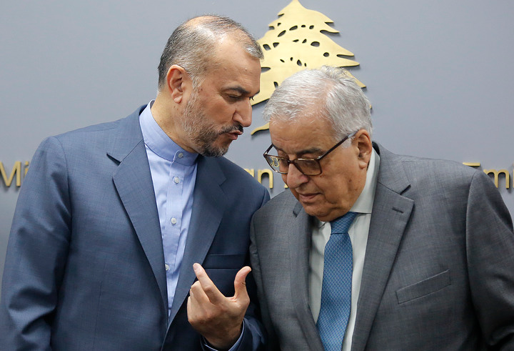 10月13日,伊朗外长阿卜杜拉希扬(左)和黎巴嫩外长哈比卜在黎巴嫩首都贝鲁特出席记者会。新华社记者刘宗亚摄