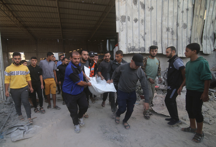 10月15日,在加沙地带南部城市拉法,人们从遭以色列空袭后的受损建筑中抬出遇难者遗体。新华社发(哈立德·奥马尔摄)