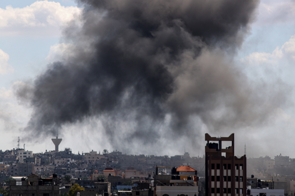 10月15日,加沙地带南部城市汗尤尼斯的建筑遭以色列军队空袭后升起浓烟。新华社发(里泽克·阿卜杜勒贾瓦德 摄)