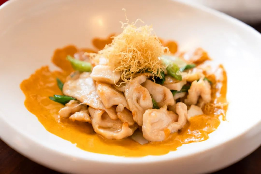 这道菜则会更加偏东南亚风味一些,主厨特意将咖喱比例调淡,印度食客可能会觉得不够浓,但在亚洲口味里会觉得刚刚好。用葱片和姜丝滑炒大块的鸡片,不柴不干,吃一口就觉得很香。