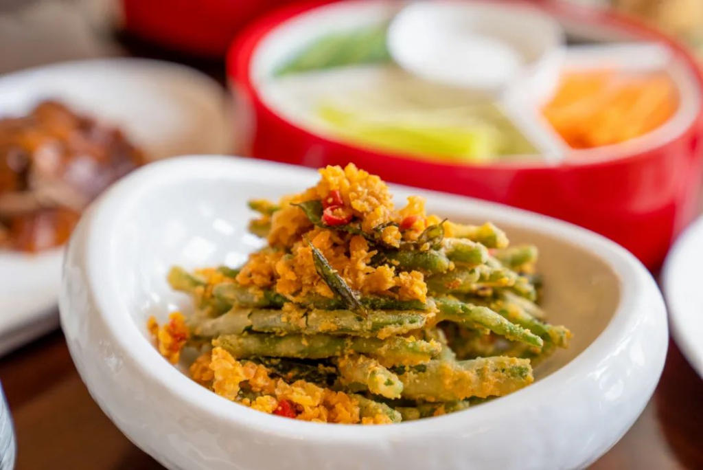 干煸四季豆是外国人非常喜爱的中式素菜,但结合咸蛋黄一起干煸的倒不多见。首先干煸后的四季豆口感极脆,内里竟然还能尝到四季豆的清脆水润,一点也不油。而灵魂咸蛋黄又丰富了口感,增加了更为浓郁的香气,一定要试一下。