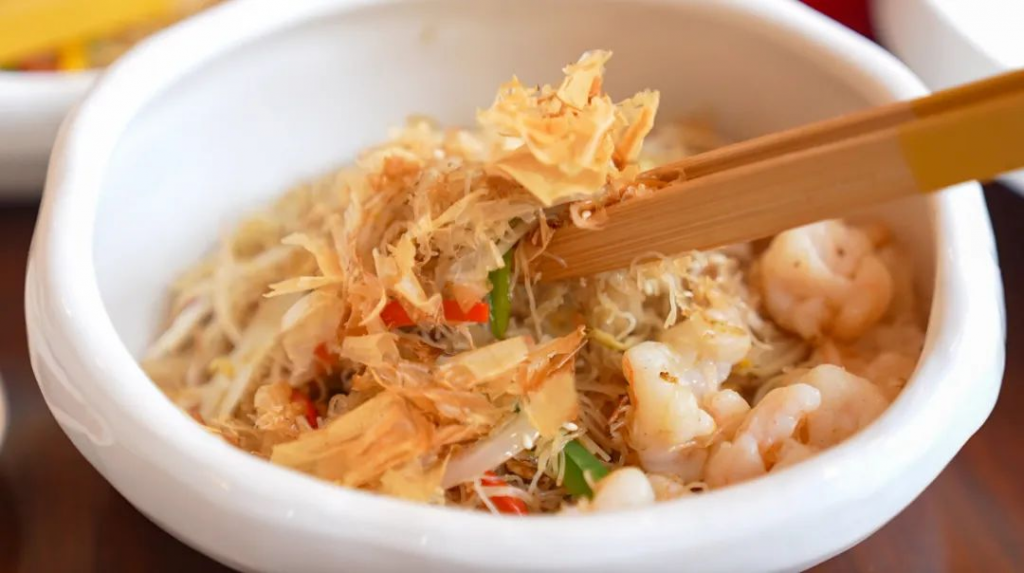 主食我们选择的是星洲米粉。米粉选用的是温州粉干,特别细,吃起来口感不像传统的湿粉那么油,而是越嚼越香。配合着鸡蛋的香气,豆芽的清新,鲜甜的大虾一起爆炒,炒出锅气。最后铺上层层墨鱼花作为点缀,瞬间香气扑鼻。能吃辣的可以搭配小料碟里的辣椒酱和腌萝卜作为配菜,会更加入味。