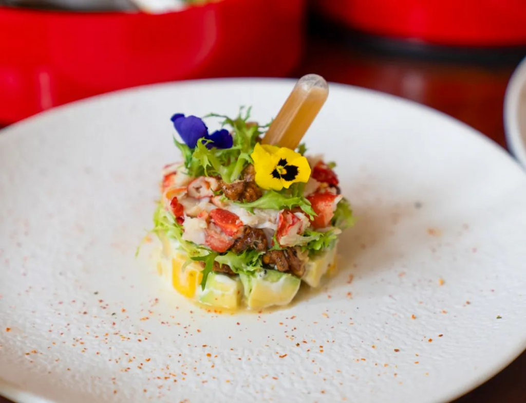 蟹柳用的可是帝王蟹柳,蟹肉搭配苦菊菜、牛油果、芒果粒作为承托,淋上柚子汁,再用黑椒琥珀核桃仁点缀,有着独特的清爽口感,非常开胃。
