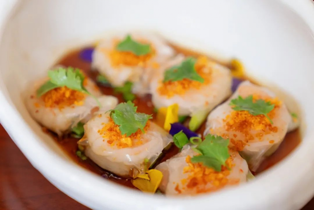 晶莹剔透的米皮虾卷一眼就可以看到鲜嫩完整的虾肉,用清脆的马蹄做衬托,配着京葱和避风塘料,淋上特制的红油醋,一口咬下去,口感层次非常丰富。