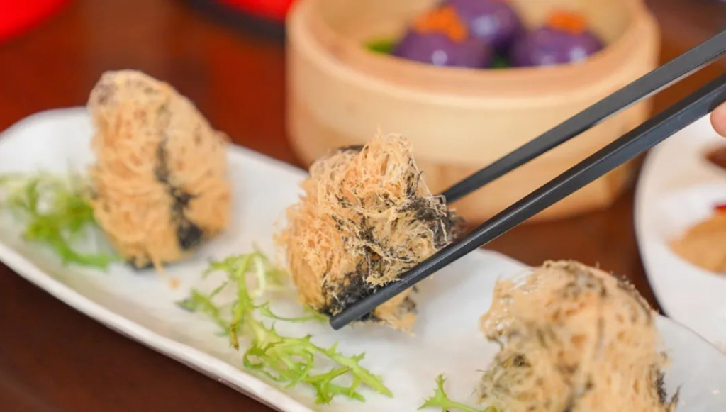这道点心从外表来看就很有特色,层层绵绵像鸟巢一样的细丝,营造出怒发冲冠的样子。有趣的是其中外表黑色部分是用墨鱼汁挑染出来的,真是细活儿。内里包裹的有鸡肉,油酥,香菇等等,吃一个就感觉有点饱了。
