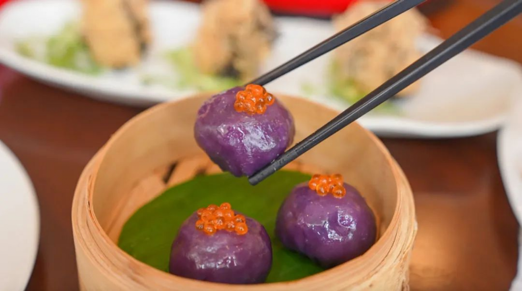 这道点心同样色彩丰富,用紫甘蓝汁染色制成饺皮,蟹肉虾仁、清脆的芦笋和胡萝卜碎制成内馅,顶部点缀些许三文鱼籽,一入口,有种百花齐放的感觉。