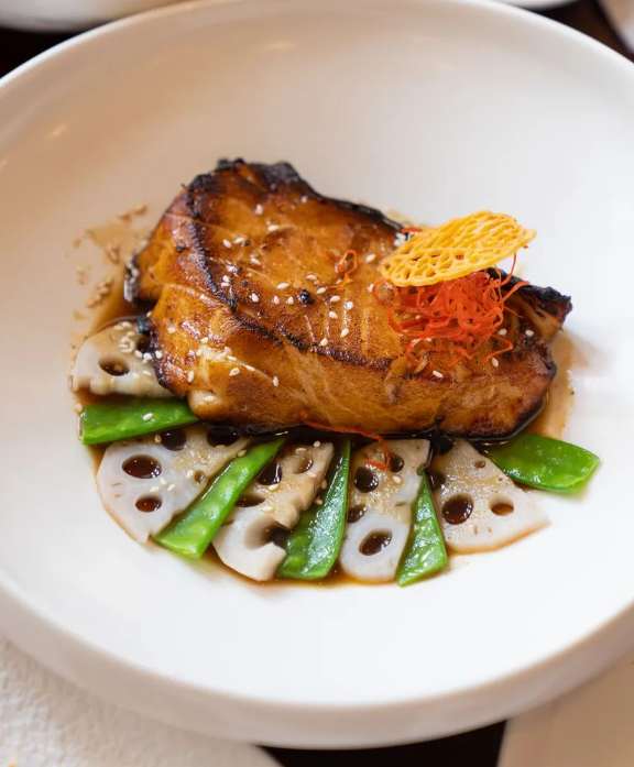 小编个人超级推荐的一道,炉子里烤出来的鳕鱼非常鲜美,基本入口即化,还能吃出了一丝奶香气。淋上特调的酸甜口蜜汁,用豆荚和藕做点缀,再撒上些许白芝麻,让人回味无穷。