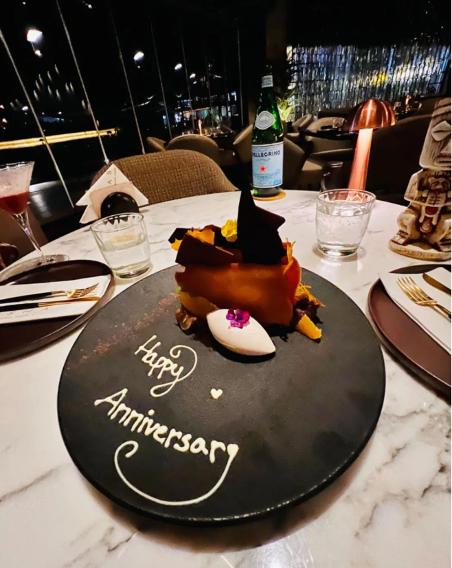 Dasha虽然价格略贵,但绝对值得体验,哪怕是对中餐十分挑剔的国人也会不虚此行。烤鸭、羊排这些常见的经典菜,因为食材新鲜以及私家酱料,都可以品尝到不同以往的美味。烤鸭的烤饼十分筋道,在沙特各家烤鸭中算是出类拔萃了。除丰富的菜品外,Dasha的无酒精特调鸡尾酒花样繁多,就在眼前的吧台区现场制作,大部分保持自然甜度,清爽健康。最后强烈推荐一款以沙特知名发展项目The Line命名的甜点,各种口味的巧克力和乌龙茶慕斯搭建而成的一道甜品墙,实在是惊艳。这个甜点的分量很大,两到三个人分享足够了。我们当天有纪念日,预定时填写了信息,后来服务人员端着写了纪念日祝福的The Line出来,也是十分贴心了。