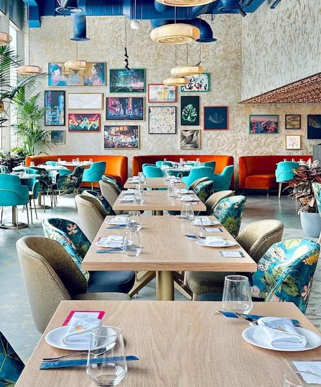 Hua Lan所在的半开放式商圈Midtown,是利雅得市中心炙手可热的地段,周边有各大咨询公司和高级酒店,华为的办公地也离此不远。内部装修是HuaLan的特点与卖点,以孔雀蓝为主基调,各种蓝色与彩色色块在这里碰撞出让人过目难忘的观感体验。白天鲜艳、晚上浪漫。餐厅二楼有户外景观位置,还有一个私密的聚会用餐区,有一张巨大的长条餐桌,大概可以坐20人左右,临落地窗而设,可以享受无遮挡的Mid-Town景观。这里吐槽一个不大协调的地方,如此立意现代且高端的中餐厅,居然使用的是一次性木制筷子,有些煞风景。