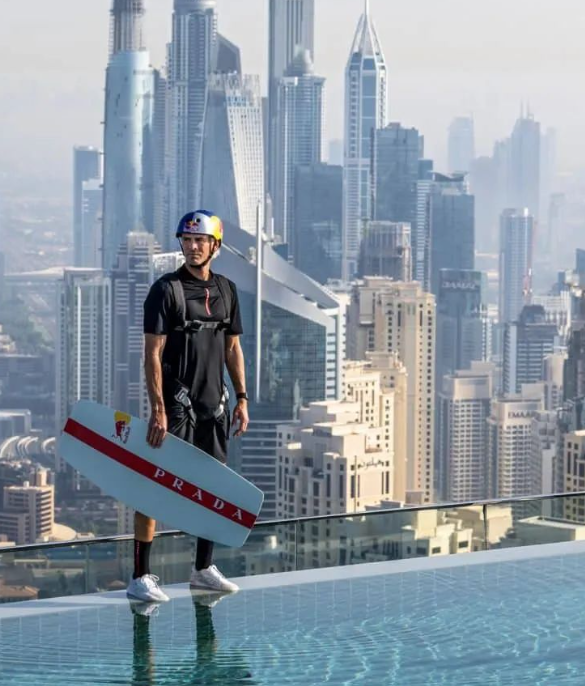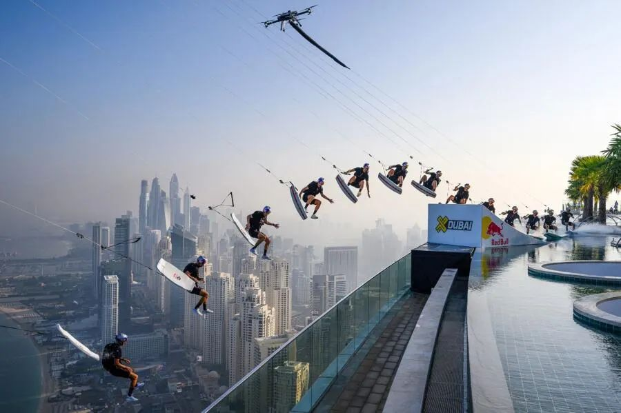 11月29日,美国花式滑水先驱、三届世界冠军Brian Grubb来到迪拜,在全球最高的屋顶泳池玩起了花式滑水+定点跳伞。