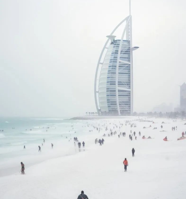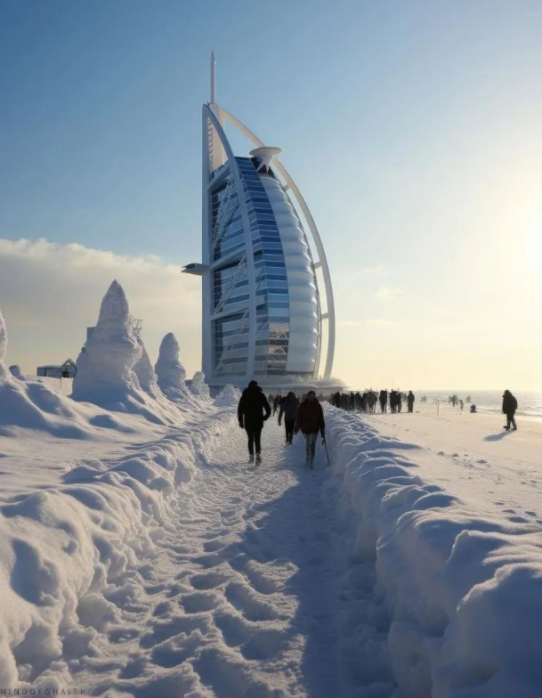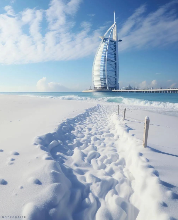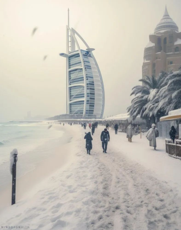 最近AI和数字艺术家Ghaith创作一组迪拜雪景图,展示了迪拜如果遭遇西伯利亚般的大雪,会是什么样子——