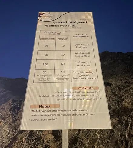 为了控制山顶的人流量,在前往Al Suhub Rest House休息区的山脚下是有个收费站的,开车上山采用的是阶梯收费,而在Fen Café中就餐消费超过50迪拉姆则可抵两小时停车费。这里有个小Tip是,如果想在山顶逗留较长时间,可以选择把车停在山下徒步上山,但如果只是吃个饭、喝点东西短暂停留,那还是开车更方便一点。