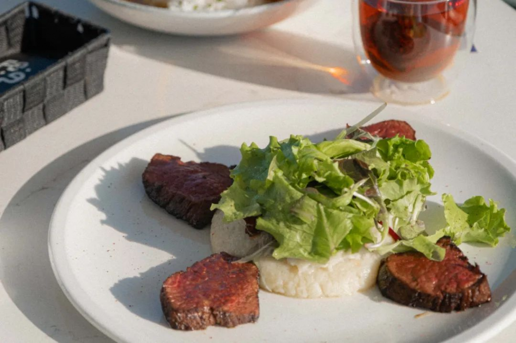 这块用的是澳洲和牛腰臀部位的三叉牛排,五成熟的牛肉外表已经烤到微微带脆,香气扑鼻,肉质也是非常柔软,有着浓烈的牛肉风味,和淡淡和牛油脂的香气,吃起来扎实又饱满。搭配清爽的沙拉与绵密的土豆泥,作为配菜来说都是很优秀的。