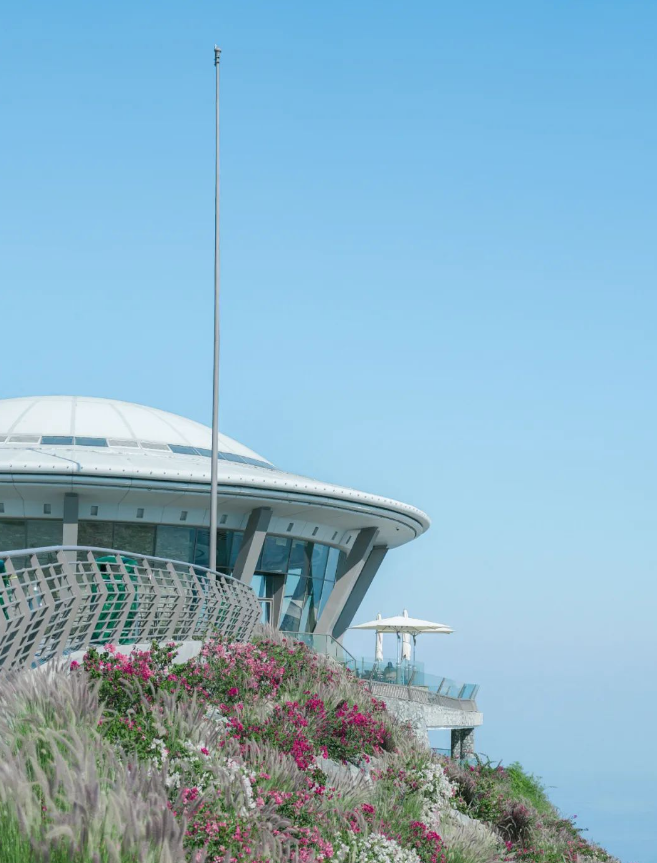 Al Suhub Rest House是一个直径30米的飞碟状建筑,外观上很抓眼,搭配全景窗和小错层,可以360度无遮挡从高处欣赏沙迦东海岸的全景,可谓是将自然休闲诠释到了极致。而Fen Café便坐落其中。