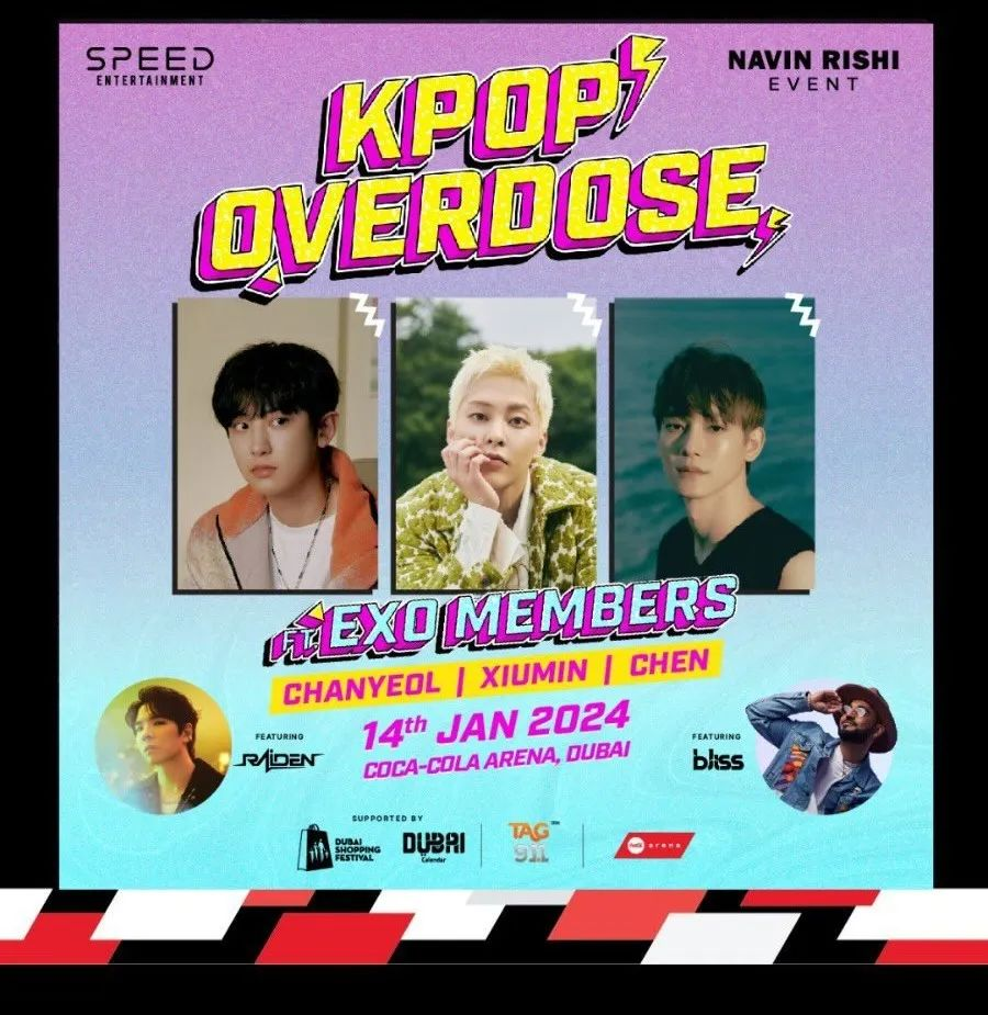 作为“K-Pop Overdose”之夜的一部分,朴灿烈(Chanyeol)、修敏(金珉锡)和金锺大(Chen)将在1月14日(星期日)登台表演。门票现正通过dubai.platinumlist.net公开发售,票价195迪拉姆起。但请注意,16岁以下的观众必须由18岁或以上的成年人陪同入场。14岁以下儿童不得进入歌迷站立区或普通站立区(Fan Pit Standing zone or the Regular Standing Floor Area)。