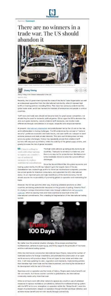 4月30日,中国驻阿联酋大使张益明在阿联酋主流媒体《国民报》发表题为《贸易战没有赢家 美国应当改弦更张》的署名文章,揭批美国发动关税战,表明中国坚定维护自由贸易体制的意志决心。全文如下: