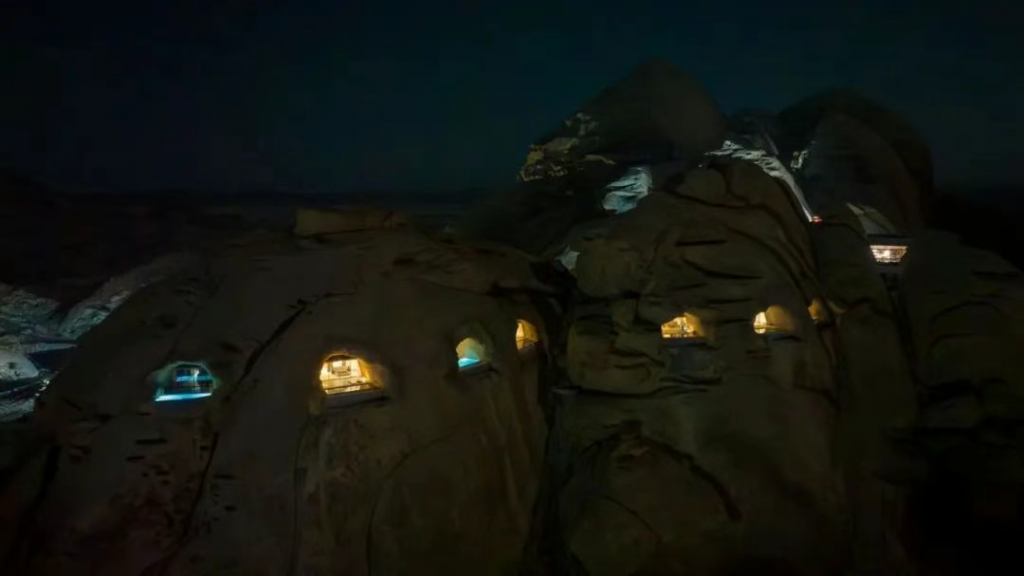 所有的山洞房型是真的在石头里面住。据说建筑方是先使用TNT在岩石内部炸开,再在炸开的空间里建造房间的。虽然身处在现代化的酒店客房里,却能触摸到沉寂上千万年的原始岩石的肌理。