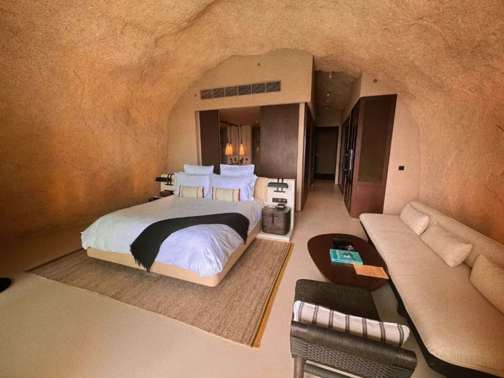 客房色调以沙色、岩灰和日落金为主,低饱和度的搭配让整个空间与周围大地浑然一体。墙面是未经雕饰的天然石材,地板则选用环保木材或石材铺设,家具线条简约流畅,细节满满,让空间在低调中透出独特的文化气息。