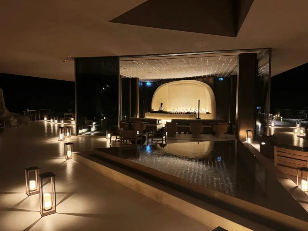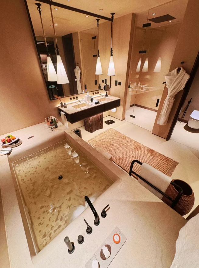 随后会切换专门的高尔夫球车进入酒店,路上就直接被眼前的景色震惊。酒店的设计是完全与自然景观融合的,房间、餐厅等设施大多都是建造在山崖甚至山缝之间,恍惚间有一种不真实的穿越感。原来官宣视频上的效果不是AI,都是实拍,而且亲眼所见比视频里更加震撼。