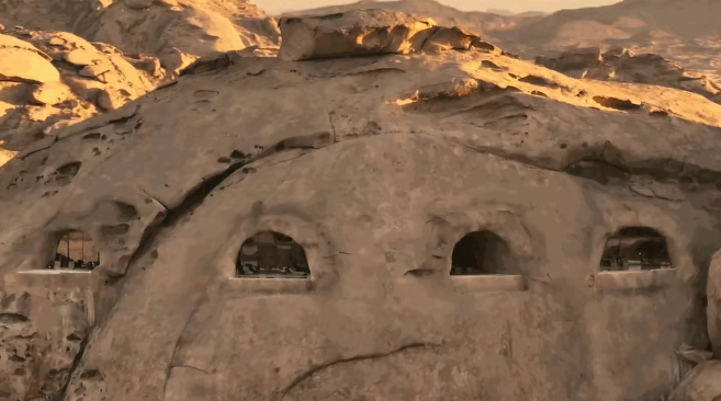 从高空俯瞰,酒店本身就像是一块自然生长于沙漠中的巨石,并在阳光的照耀下展现出多变的色彩,这种大胆的设计实在令人惊叹。