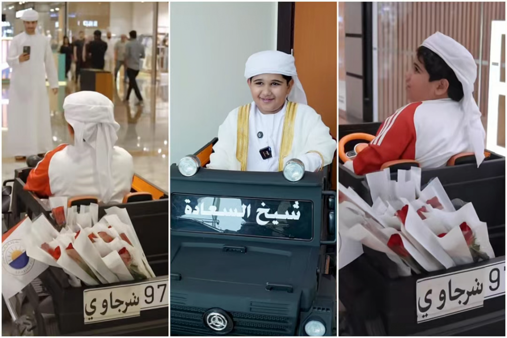您或许见过一位阿联酋小男孩,笑容灿烂的他开着一辆黑色小奔驰,然后给大家送花。