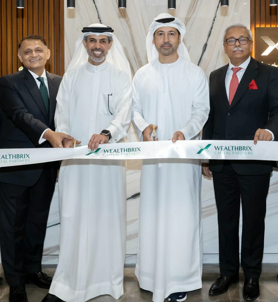 Wealthbrix Capital Partners董事长Hamad Buamim(左二)、副董事长Suvo Sarkar(右一)、首席执行官Rajesh Khanna(左一)、DIFC首席执行官Arif Amiri(右二)在公司成立仪式上剪彩。