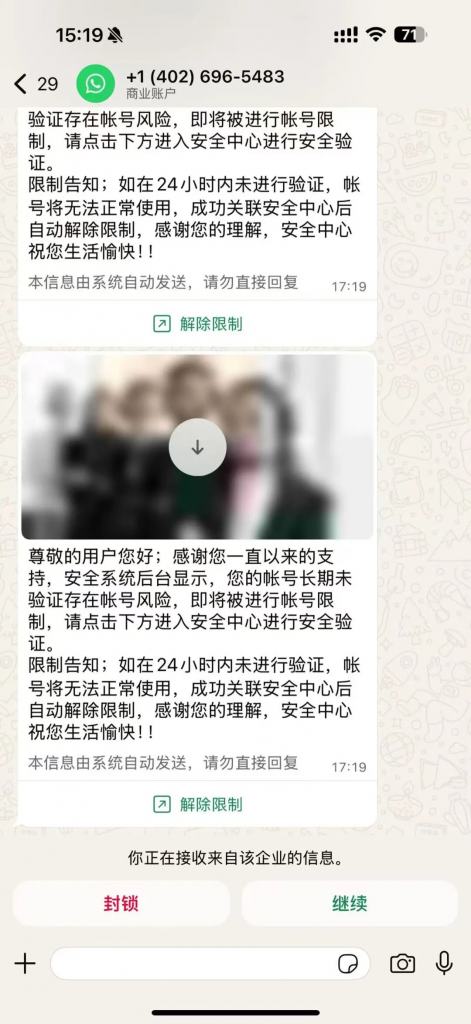 而这看似是 “安全验证”,实则是诈骗分子的钓鱼陷阱。一旦用户点击 “解除限制” 链接进行验证操作,就会在授权诈骗分子获取自己WhatsApp的账号权限。随后,诈骗分子会伪装成受骗者向其好友发布假消息,以各种借口索要或借取财物,尤其是虚拟货币(如USTD),目前已有不少华人中招。