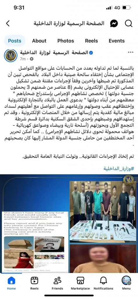 关于部分社交媒体账号所传播的有关一名中国女游客在埃及境内失踪的消息。经调查核实,她与其他几人已被依法控制,因其隶属于一个专门从事电子诈骗的犯罪团伙(该团伙共8名成员)。该团伙的犯罪活动主要是以在埃及从事电子商务工作为名,诱骗受害者(大部分是其本国同胞),待其抵达后便实施绑架,并强迫他们与家人联系,以支付通过电子平台发送的赎金。警方已在其第一定居点的一所住宅公寓内将他们锁定并逮捕,并查获了枪支、白刃武器、电击枪以及若干包含其犯罪活动证据的手机。同时,一名与她在一起的、上述国籍的被绑架者也已获救。