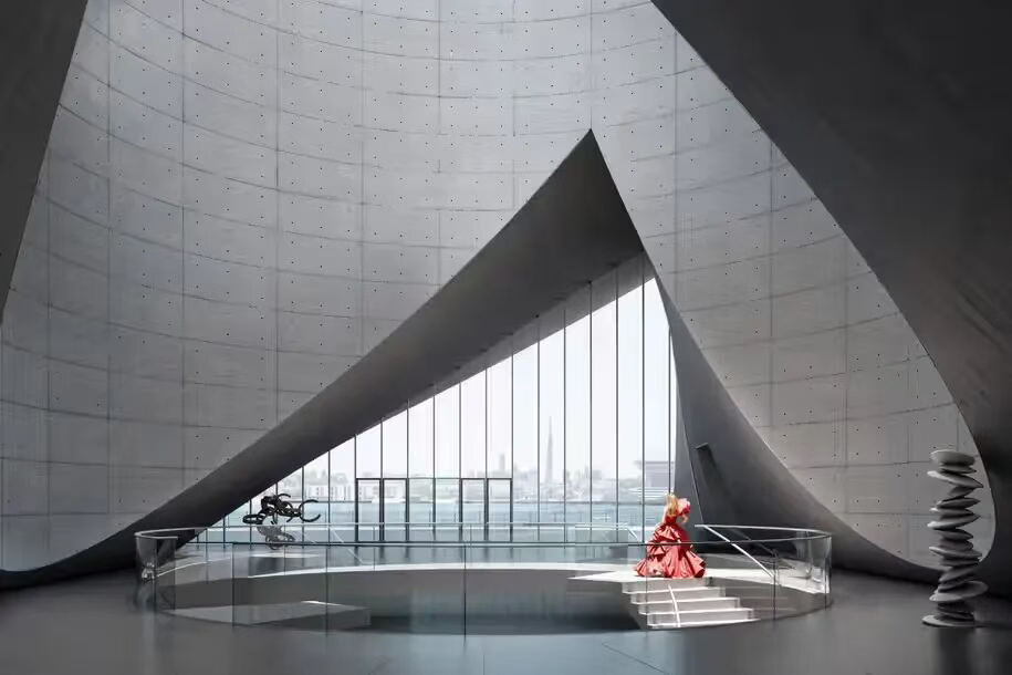 以水、天空、风与光为灵感,最新释出的五层迪拜艺术博物馆(DUMA)渲染图中,弧形白墙被三角形开口有节奏地点缀,并向上渐次收束。日落时分,馆体表面映照沙漠天空的流转色阶,柔化了凌厉的折线,让建筑更显圆润,氛围感满盈。