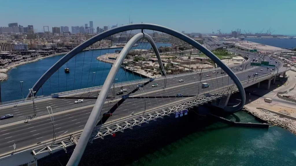 造型独特的“无限桥”正式通车,为城市交通网络再添重要节点。这座桥每个方向设有六条车道,拱形桥身设计成“∞”符号,象征迪拜无限的雄心。项目总投资53亿迪拉姆,属Al Shindagha走廊工程的一部分,旨在改善德拉、Bur Dubai及新兴社区之间的交通联通。