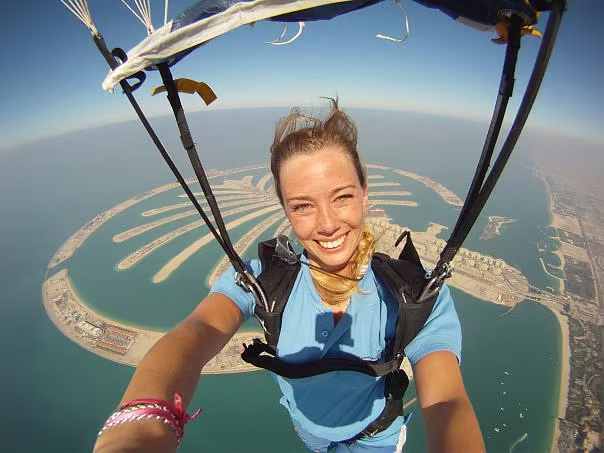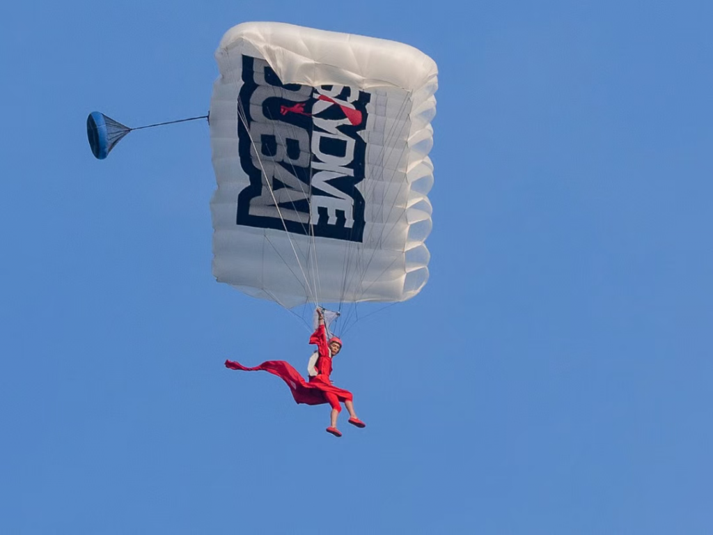 对她来说,这不仅是一次特技表演,也是她个人的圆满时刻。15年前,她在迪拜完成第一次跳伞,并降落在朱美拉棕榈岛上。
